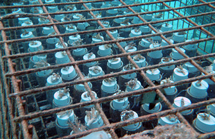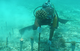 4.海中に設置したポールにサンゴをセットします。
